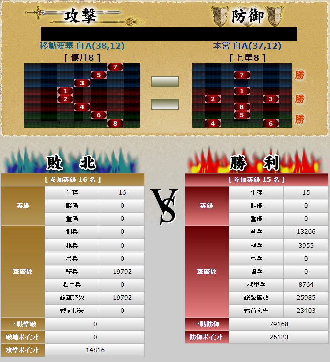 陣形相性は負けていたし、兵研究もまだ上位(太刀や重機甲)だったとはいえ、最後は全兵が戦死して全英雄が負傷&疲労困憊に追いやられ完敗。やはり紫は強かった。これにもしトップランカーのあの方が来ていたら間違いなく1発でこうなっていただろう・・
