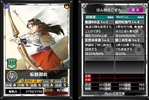 自身含む戦国英雄の兵数増加。戦国英雄が揃っていれば使いやすい性能だが、ほぼ上位互換の甲斐姫がいると少々物足りなさを感じるか・・