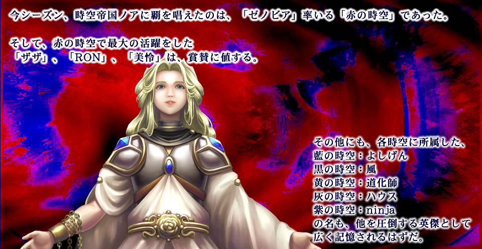 W1-18で勝利したのはゼノビア率いる赤時空。少人数ながら歴戦の強者達が集う強連合の圧倒的な強さと活躍で圧勝。実は自身もそこに所属してました。尤も私自身は他の連合員の方達には遠く及ばない戦力で、ほぼ連合員の方達のご厚意で在籍させて頂いてる身でした。