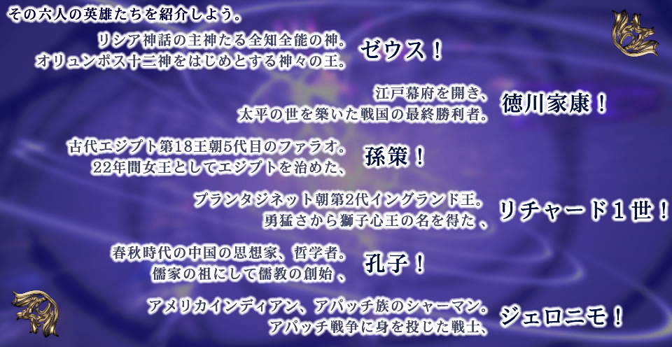 左から「孔子」・「徳川家康」・「ゼウス」・「ジェロニモ」・「リチャード一世」・そして「ハトシェプスト」とだと思う。今まで男性4・女性2の割合だったのに、今回は女性英雄は「ハトシェプスト」ただ一人。それにしても何とも濃い人達が揃ったものである。何だかFF4の「伝説のパーティー」を思い出す(笑)